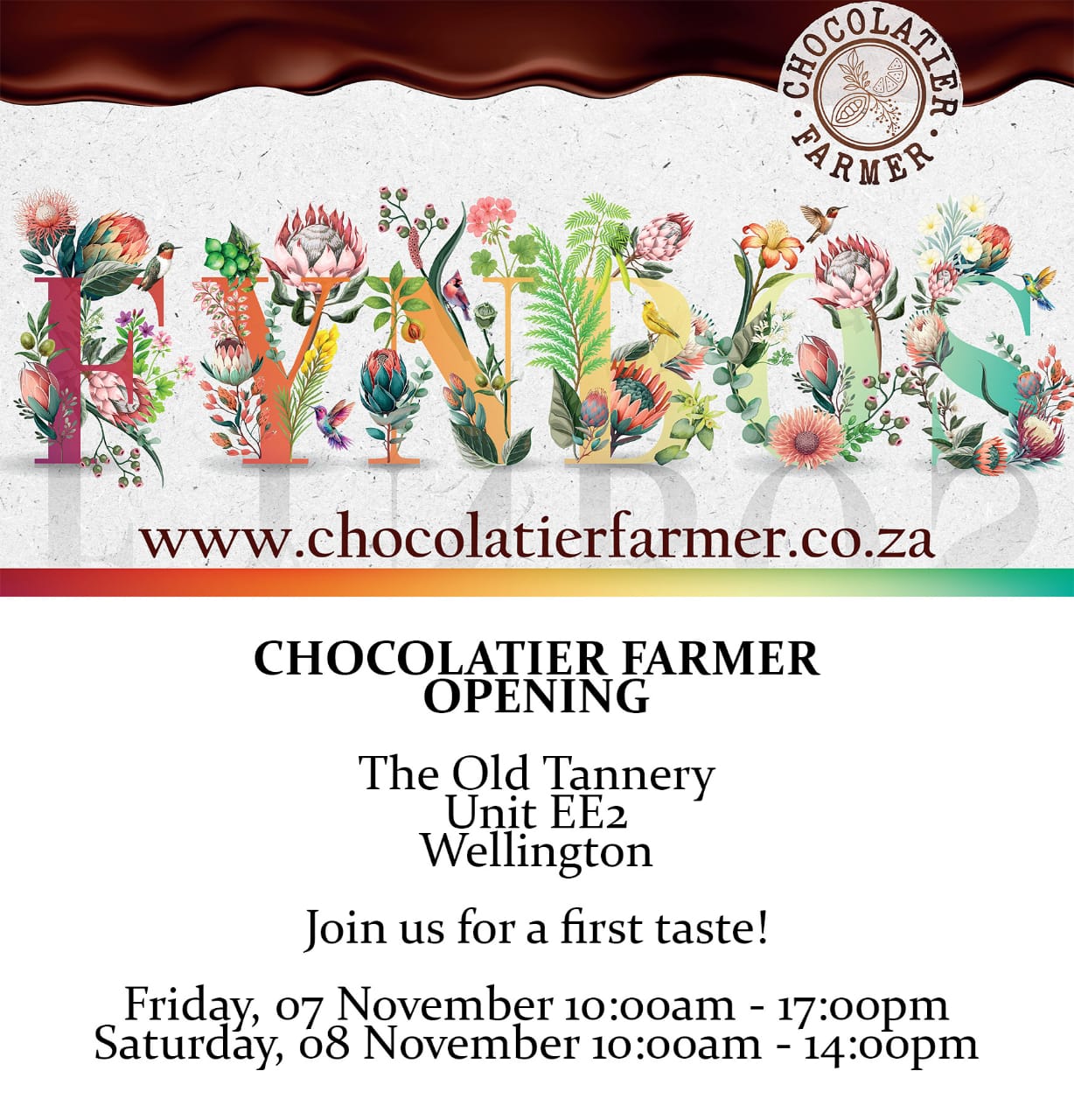 To all chocolate lovers, we are finally opening our chocolate lab and shop at THE OLD TANNERY in Wellington, South Africa this coming Friday. We will then launch the CHOCOLATIER FARMER website by December 1, 2025. Register your email below and we will send you our introduction offer!